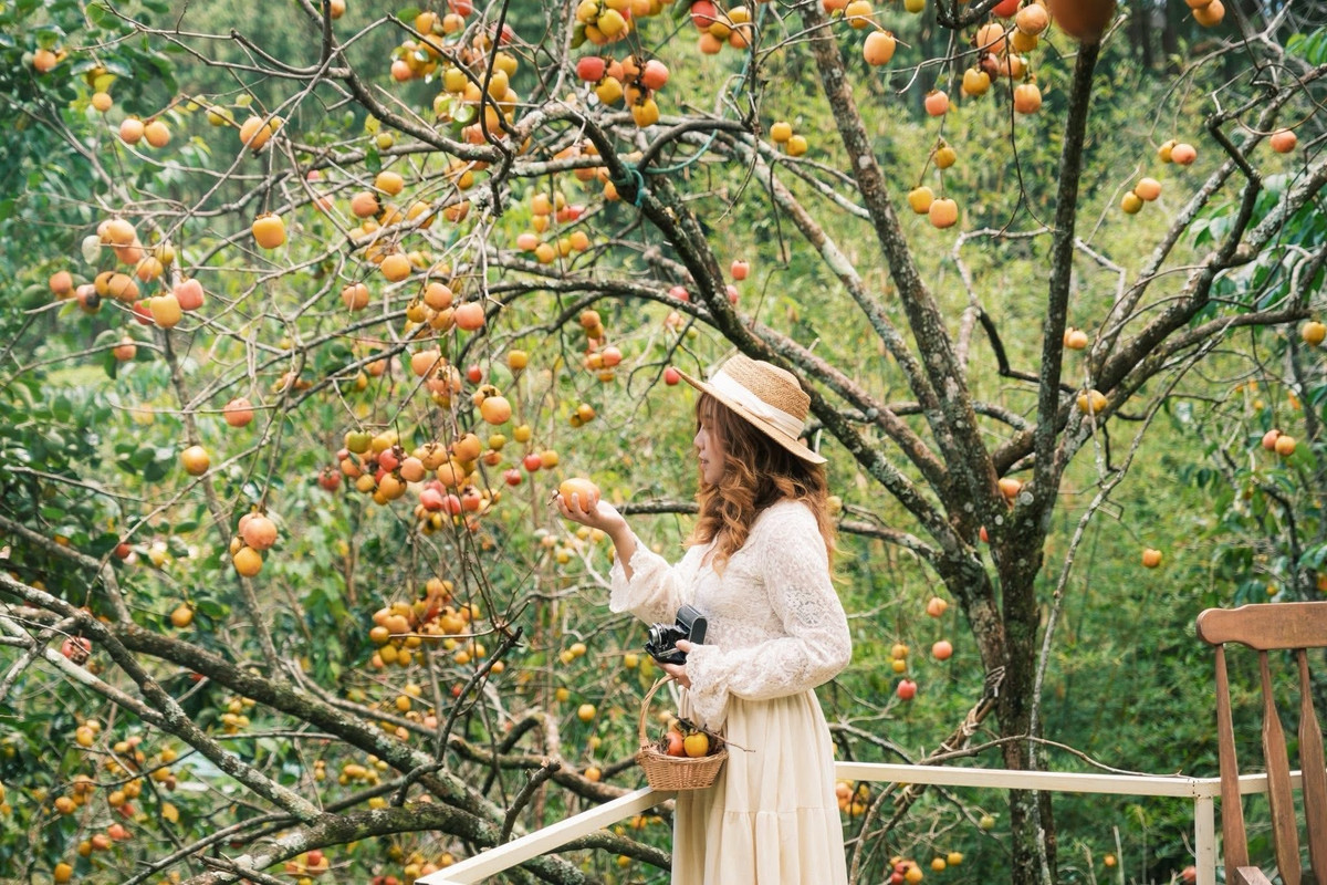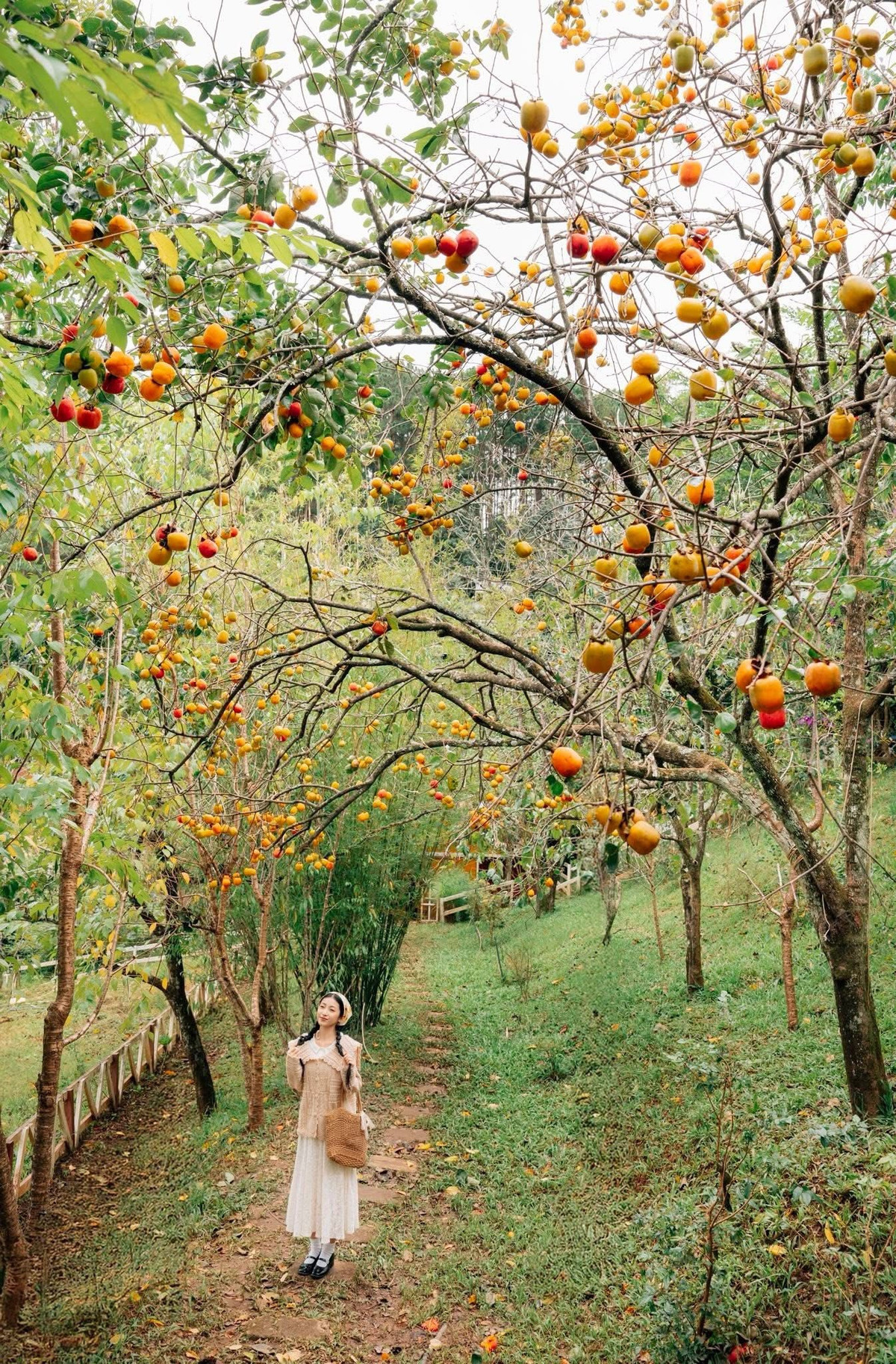Tháng 11 cũng là mùa hồng chín tại Đà Lạt và các vùng cao nguyên như Măng Đen. Những trái hồng giòn lấp lánh trong nắng sớm, nhuộm hồng cả triền đồi, tạo khung cảnh lãng mạn. Du khách có thể ghé thăm vườn hồng ở Trại Hầm, Đa Quý hay Xuân Trường để trải nghiệm hái hồng, chụp ảnh và thưởng thức vị ngọt thanh mát ngay tại vườn. Ảnh Rừng Nhiệt Đới cafe