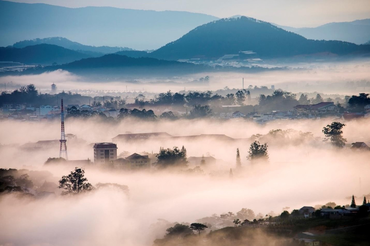 Ngoài hoa và cà phê, Tây Nguyên tháng 11 còn hấp dẫn du khách bởi những biển mây trắng xóa. Khi đêm xuống, hơi nước từ thung lũng tụ lại, sáng sớm tạo thành lớp mây dày bồng bềnh. Ảnh Datviettour