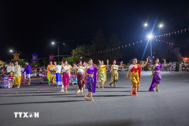 Điệu múa truyền thống của các thiếu nữ Khmer tại Đại lễ, góp phần tôn vinh bản sắc văn hóa dân tộc trong không gian trang nghiêm của Tòa Thánh Tây Ninh. (Ảnh: Giang Phương/TTXVN)