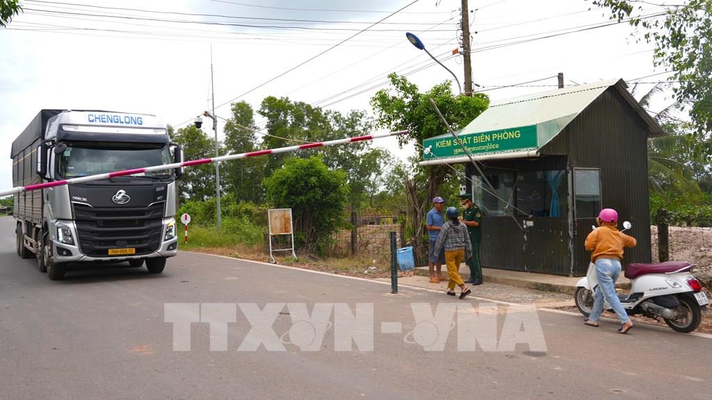 Các phương tiện và người dân lưu thông qua lại khu vực Trạm Biên phòng Cửa khẩu Phước Tân, xã Ninh Điền, tỉnh Tây Ninh. Ảnh: Minh Phú - TTXVN