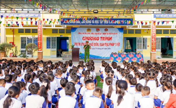 Thiếu tá Vũ Văn Thưởng tuyên truyền, phổ biến pháp luật cho các em học sinh.