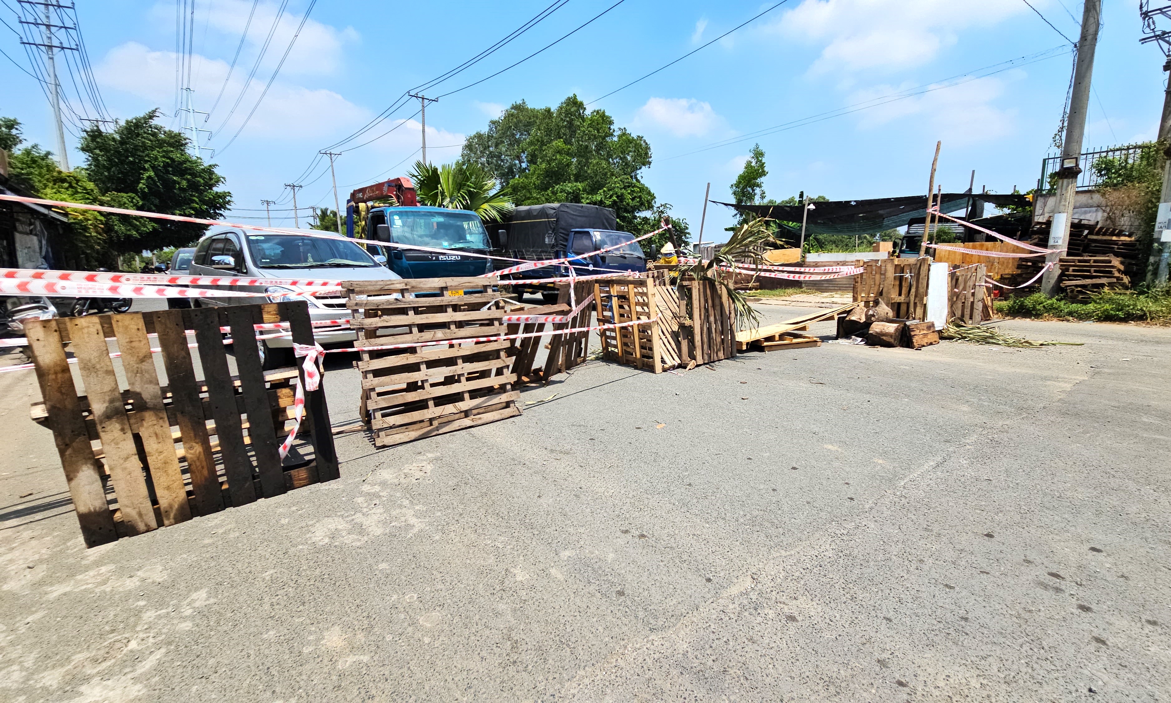 Hàng rào chắn được người dân dựng không cho lưu thông vào KDC Phúc Long để yêu cầu Chủ đầu tư KCN, khu dân cư Phúc Long tiếp tục trả tiền thuê đất. Ảnh: HUỲNH DU