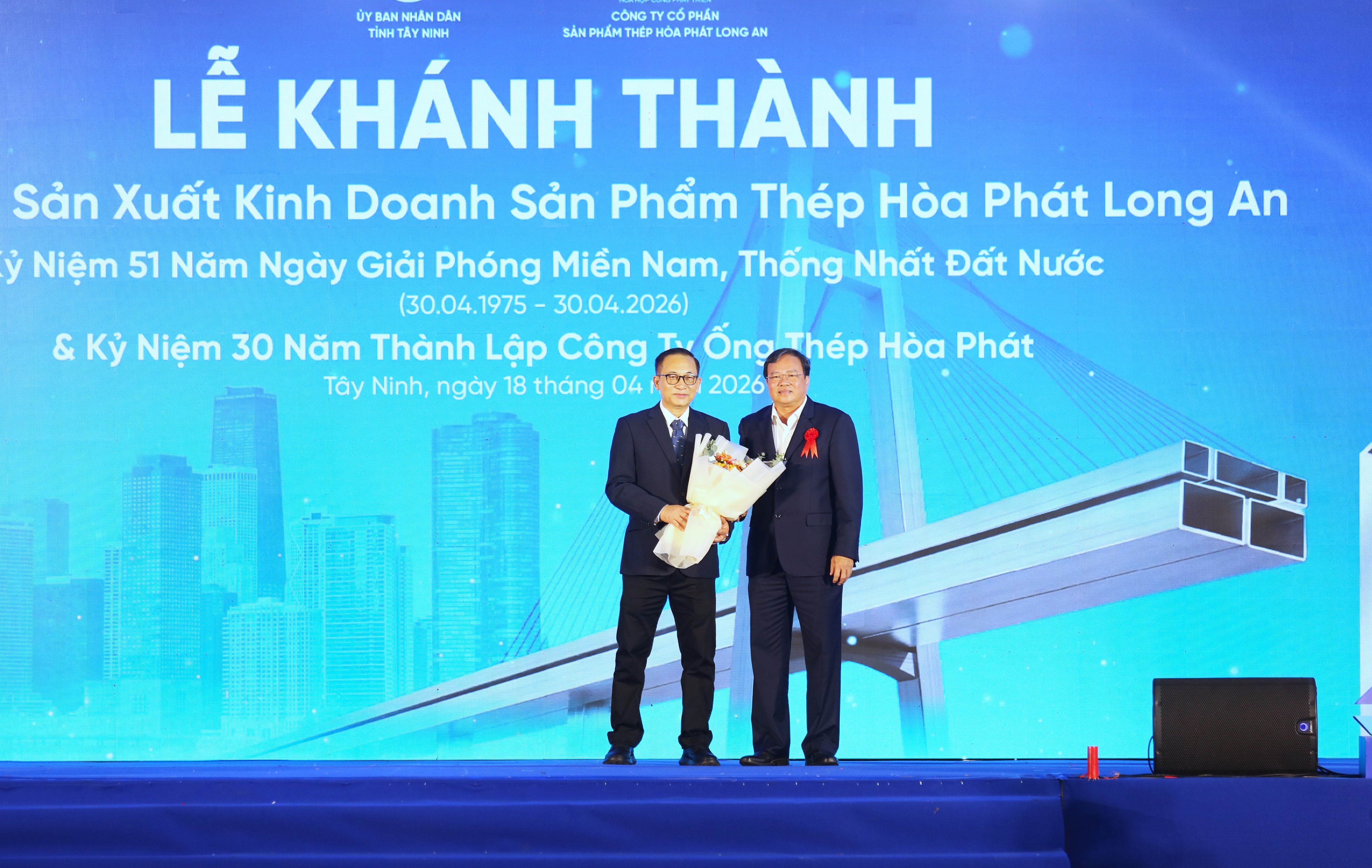 Lê Văn Hẳn,Chủ tịch UBND tỉnh Tây Ninh (phải) tặng hòa chúc mừng Công ty Cổ phần Sản phẩm thép Hòa Phát Long An. Ảnh: HUỲNH DU