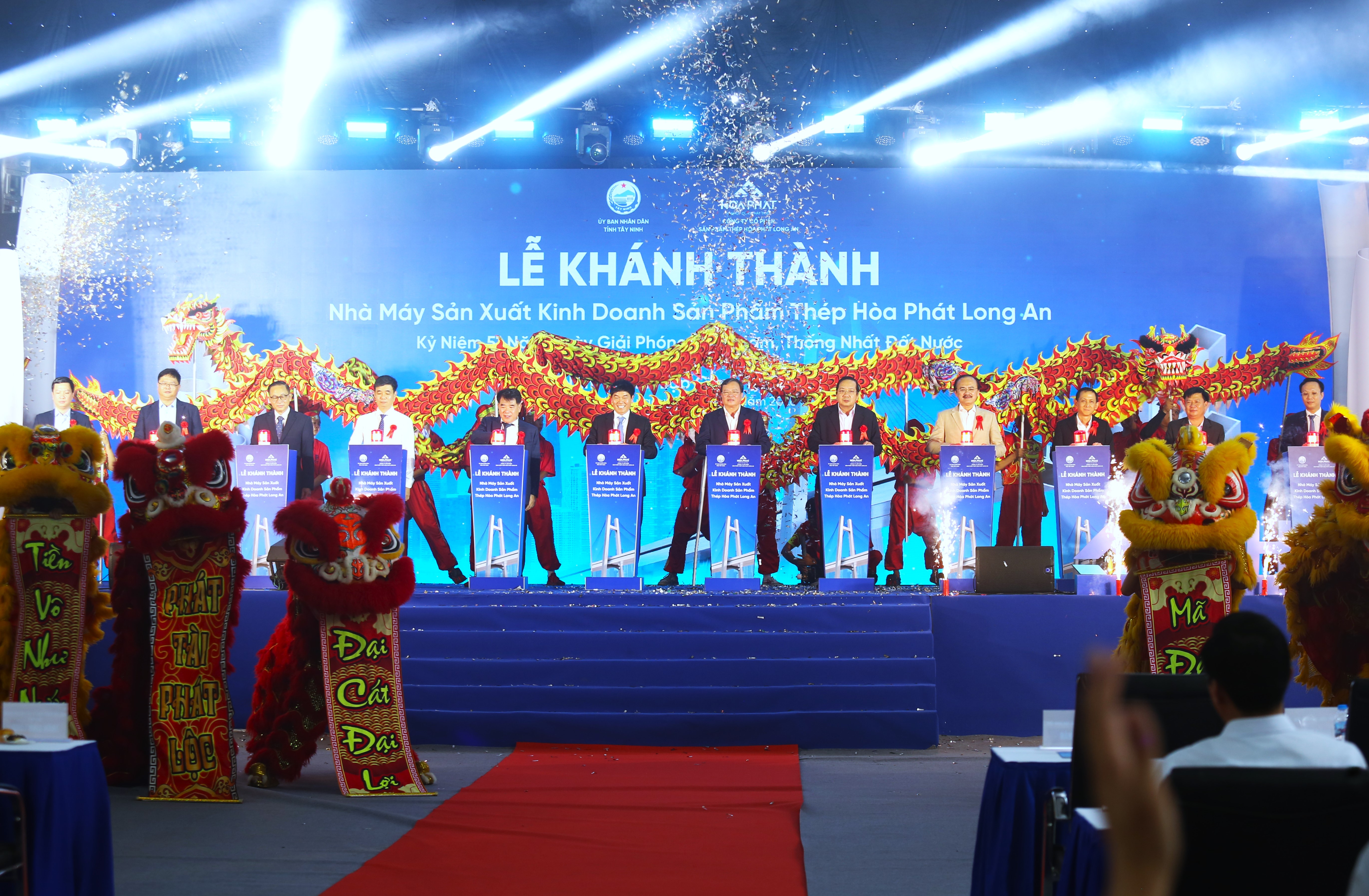 Các đại biểu thực hiện nghi thức khánh thành nhà máy sản xuất kinh doanh sản phẩm thép Hòa Phát Long An. Ảnh: HUỲNH DU