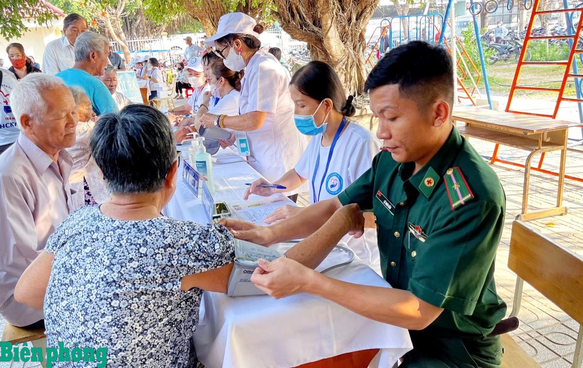 Quân y Đồn Biên phòng cửa khẩu Phước Tân tham gia hỗ trợ khám bệnh cho bà con. Ảnh: Đinh Quân