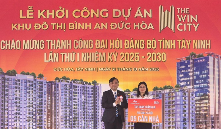 Chủ tịch Hội đồng quản trị Thắng Lợi Group Dương Long Thành trao tặng 5 căn nhà ở xã hội cho xã Đức Hòa.