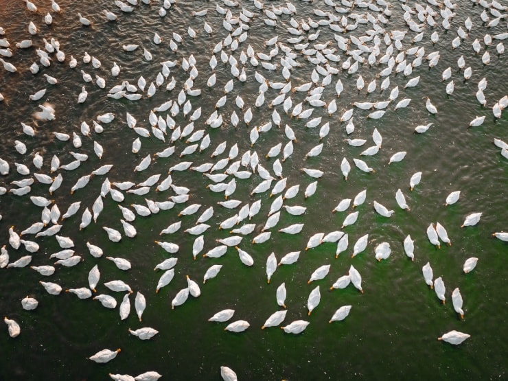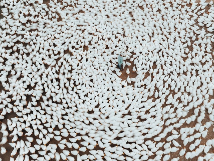 Nhìn từ trên cao, đàn vịt giống như những bông tuyết đang di chuyển trên mặt đất.