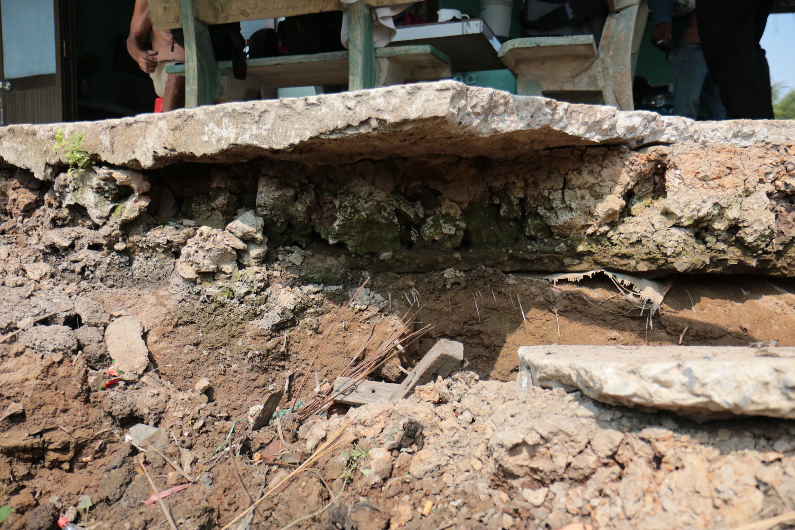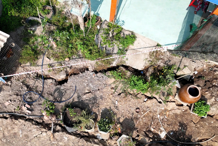 Theo đó, đoạn sạt lở dài khoảng 50m, sâu 1m, rộng 4m, bên dưới có “hàm ếch” ăn sâu vào nền đất. Sự cố sạt lở không gây thiệt hại về người nhưng đã làm hư hỏng sân, lún nền một căn nhà, ảnh hưởng cây trồng của 2 hộ dân, tổng thiệt hại ước tính khoảng 100 triệu đồng.