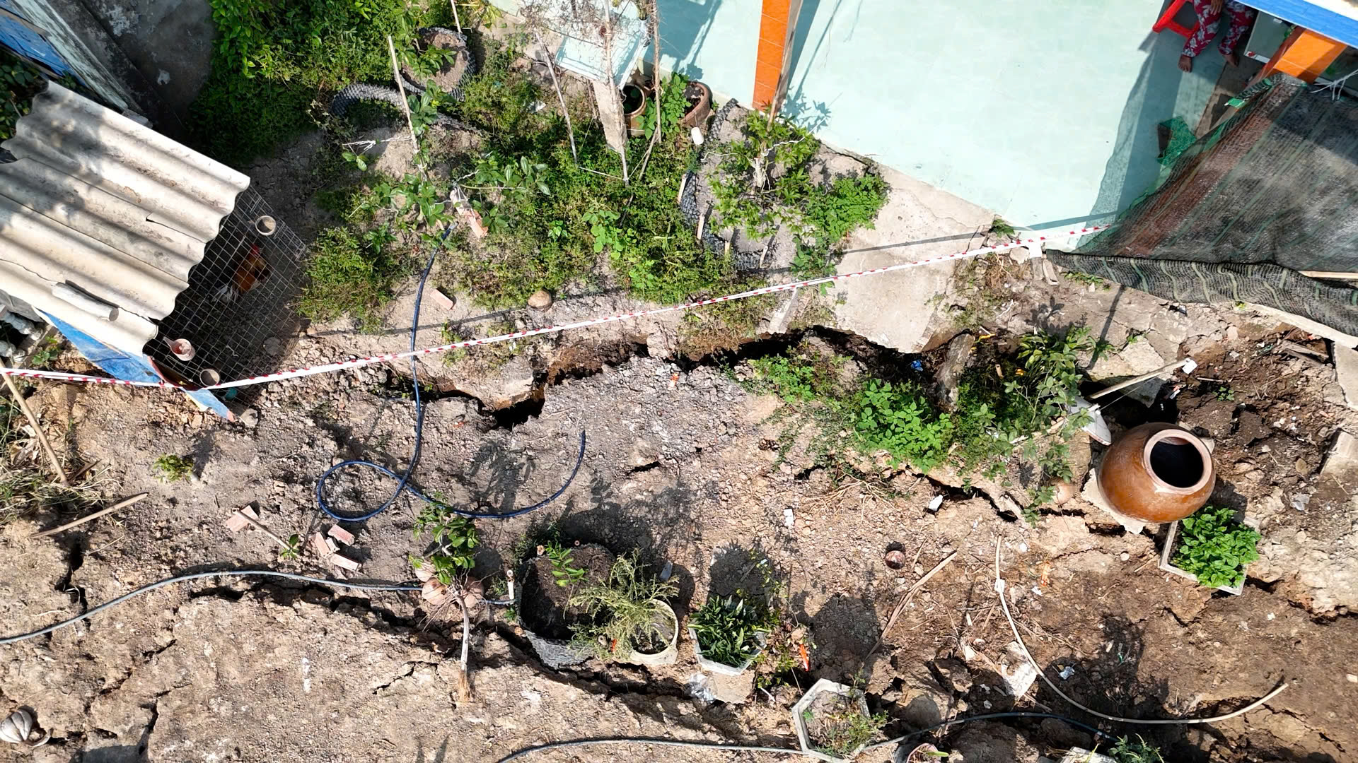 Các vết nứt lớn, sụt lún xuất hiện dày đặc, đe dọa nhà dân ở Mỹ Thạnh.