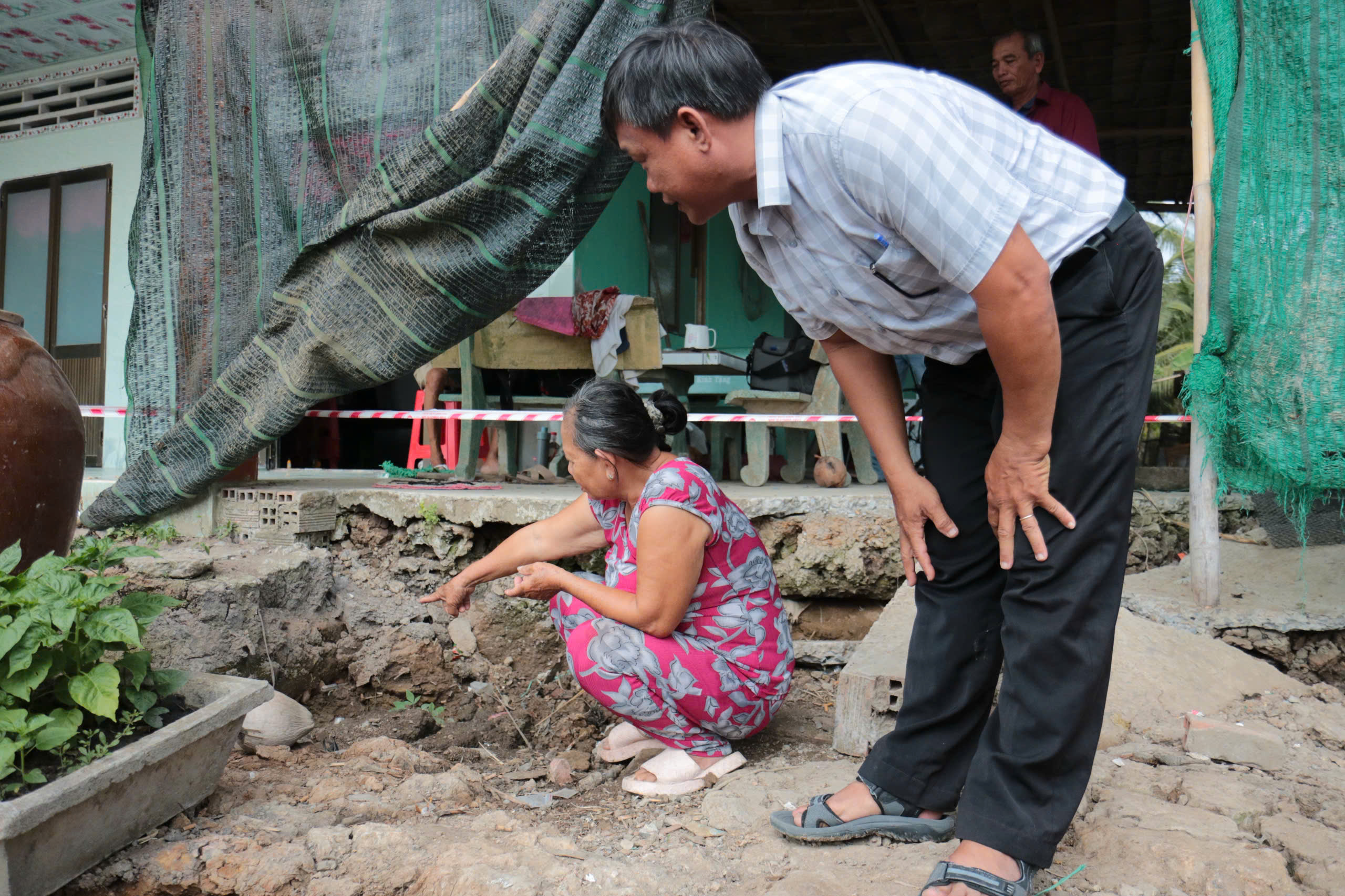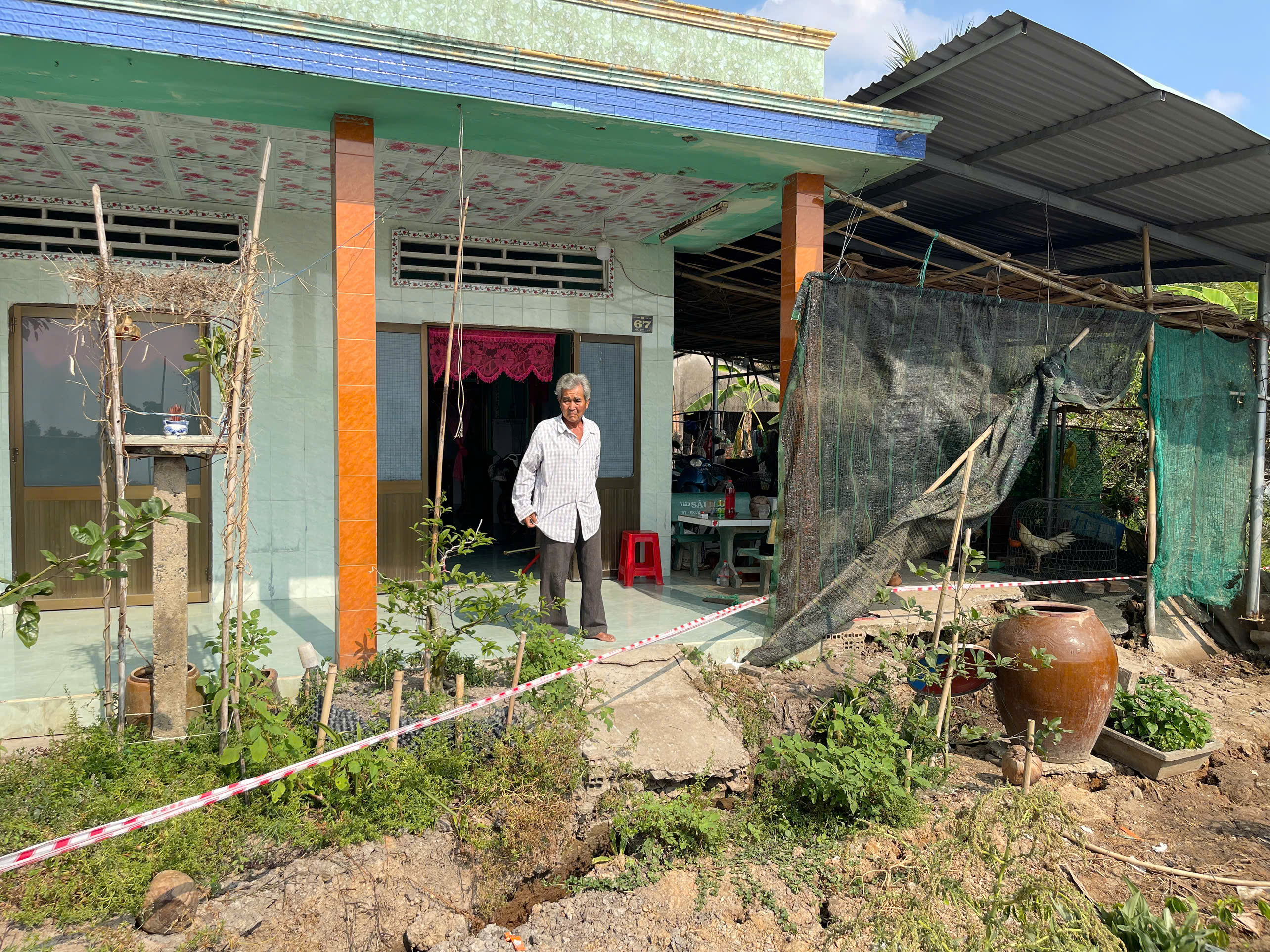 Ông Phạm Đăng Khoa (ấp 2, xã Mỹ Thạnh) cho biết: “Khoảng 10 ngày nay đất sụp xuống liên tục, càng ngày càng nứt rồi tụt dần xuống sông, có chỗ lún cả mét, có chỗ hơn mét. Giờ tôi không dám ở phía trước nữa, ban đêm phải mở cửa sẵn, nghe động là chạy. Nhà xây được rồi mà sạt lở ăn dần, lớn tuổi rồi cũng không biết xoay xở ra sao nếu mất nhà”.