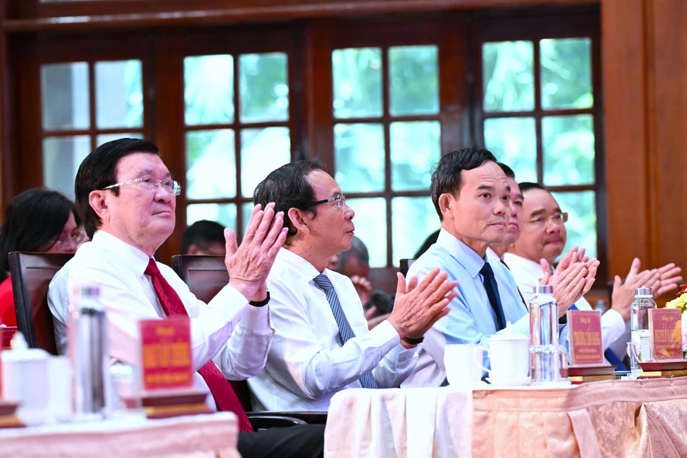 Nguyên Ủy viên Bộ Chính trị, nguyên Chủ tịch nước Trương Tấn Sang; nguyên Ủy viên Bộ Chính trị, nguyên Bí thư Thành ủy TP.HCM Nguyễn Văn Nên; ông Trần Lưu Quang, Ủy viên Bộ Chính trị, Bí thư Thành ủy TP.HCM tham dự buổi họp mặt. Ảnh: HUỲNH DU