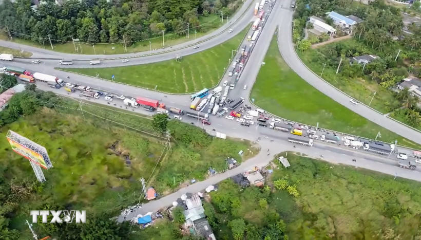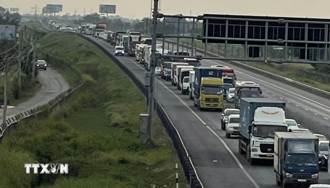 Nút giao thông bị ùn ứ sau vụ va chạm liên hoàn trên cao tốc Thành phố Hồ Chí Minh-Trung Lương. (Ảnh: TTXVN phát)