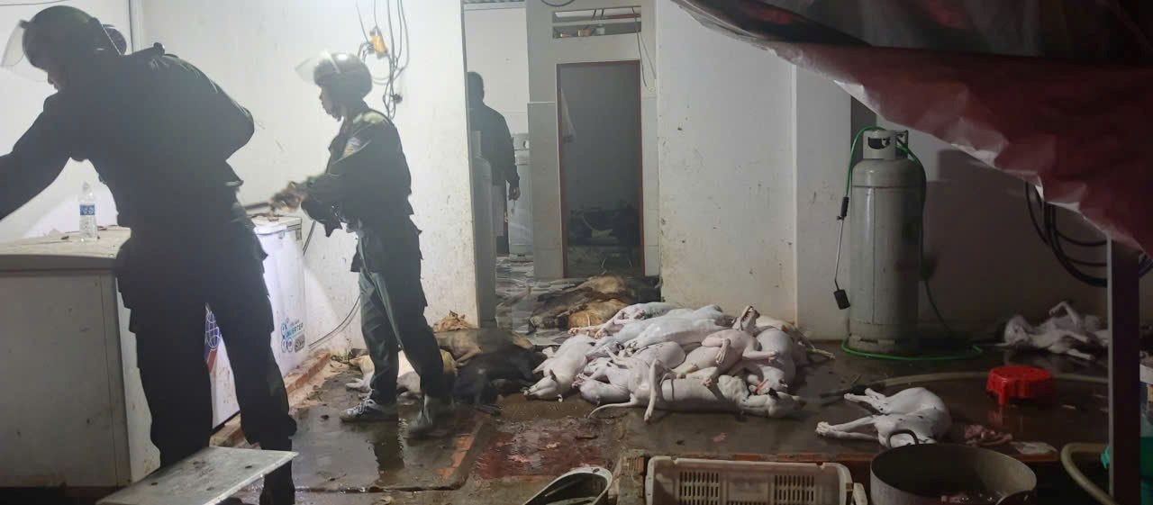Tổng tang vật tạm giữ gồm 66 con chó đã chết (844kg) và 67 con chó đã giết mổ (791kg), cùng nhiều tang vật liên quan như 3 tủ đông lạnh, bình gas, máy làm sạch lông chó, cân lò xo, 2 xe ô tô, 4 xe mô tô, 6 điện thoại di động, nhiều bộ phận súng điện tự chế và các vật dụng phục vụ hoạt động phạm tội.