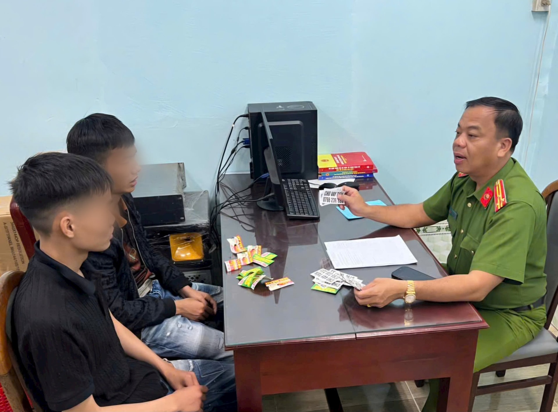 Thượng tá Nguyễn Văn Được - Trưởng Công an xã Cần Giuộc làm việc với 2 đối tượng về hành vi phát tờ rơi quảng cao "cho vay tiền" trái phép.