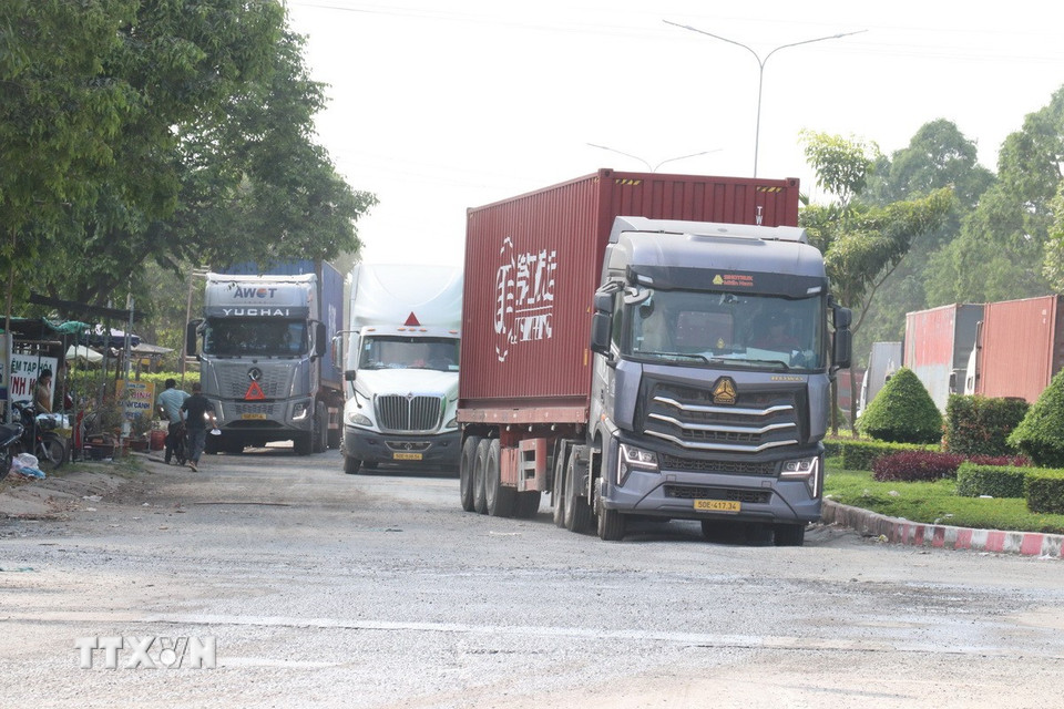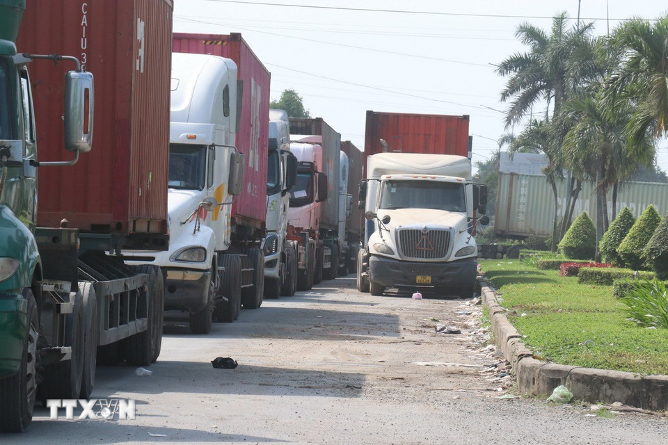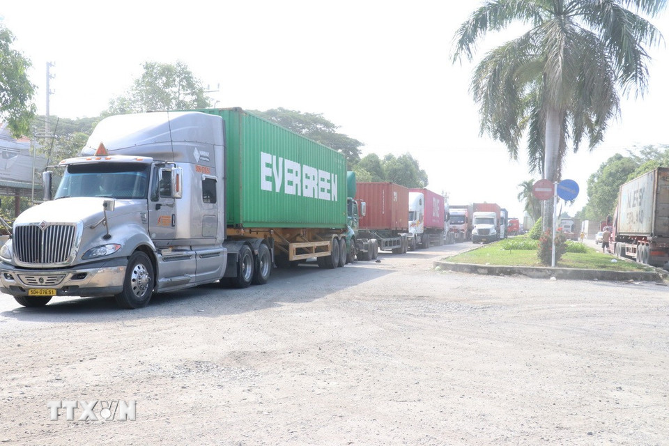 Tình trạng xe container đậu kín trên đường chính dẫn vào Cửa khẩu quốc tế Bình Hiệp (xã Bình Hiệp, Tây Ninh) kéo dài suốt thời gian qua. (Ảnh: Bùi Giang/TTXVN)