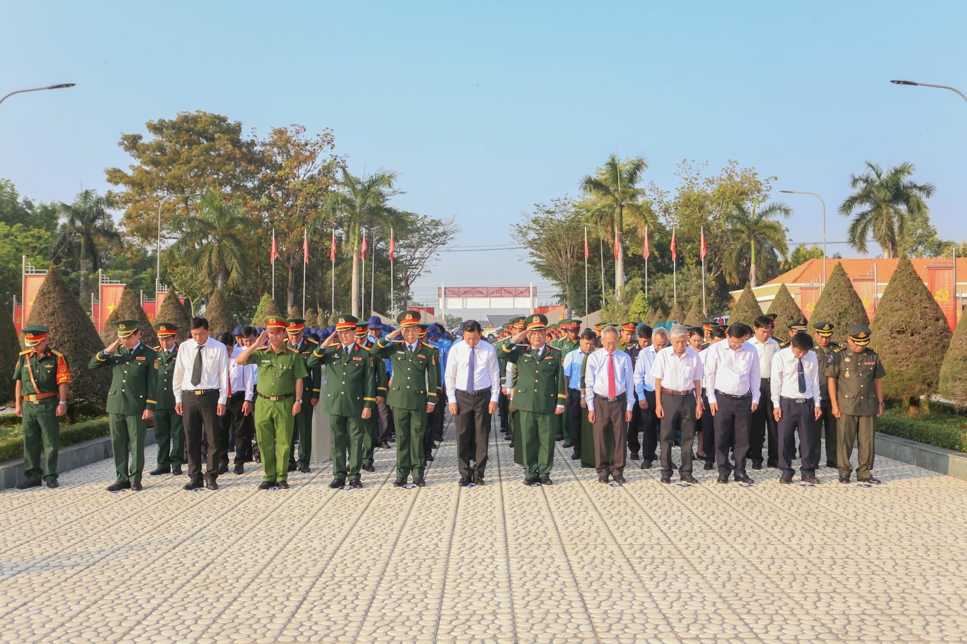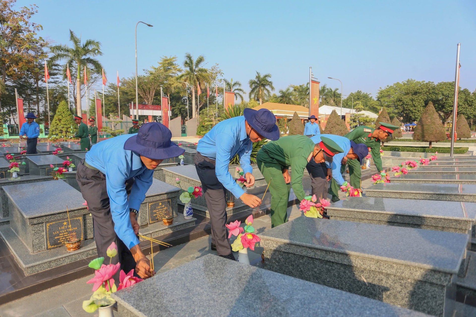 Trước khi lên đường, các đại biểu và cán bộ, chiến sĩ đã đến dâng hương, dâng hoa tại Nghĩa trang Liệt sĩ Tân Hưng – Vĩnh Hưng, bày tỏ lòng thành kính, tri ân sâu sắc đối với các anh hùng liệt sĩ.