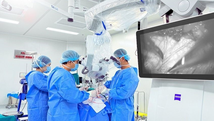 Dưới kính vi phẫu AI K.Zeiss Kinevo 900 phóng đại hình ảnh gấp nhiều lần, bác sĩ quan sát rõ từng mạch máu, dây thần kinh, màng não, nhờ đó thao tác chính xác và an toàn hơn.