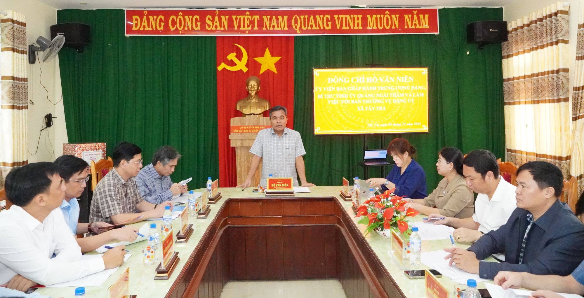 Phát biểu tại buổi làm việc, Ủy viên Trung ương Đảng, Bí thư Tỉnh ủy Hồ Văn Niên chia sẻ với những khó khăn, thiệt hại mà xã Tây Trà phải đối mặt do mưa lũ gây ra trong thời gian qua. Để thực hiện tốt các nhiệm vụ chính trị thời gian tới, yêu cầu địa phương có kế hoạch, đề nghị Ban Tổ chức Tỉnh ủy, Sở Nội vụ bổ sung cán bộ có năng lực, trách nhiệm về làm việc tại địa phương. Đặc biệt là nguồn nhân lực có kiến thức, chuyên môn về nông, lâm nghiệp để hỗ trợ người dân phát triển kinh tế, giảm nghèo bền vững.