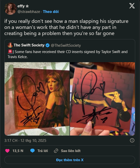 Từ một chi tiết nhỏ, làn sóng tranh luận đã lan rộng, phản ánh sự mong đợi của khán giả về việc nghệ sĩ giữ ranh giới rõ ràng giữa nghệ thuật và đời sống cá nhân. Với Taylor Swift, người từng biến mọi câu chuyện tình thành những bản hit triệu view có lẽ chính cô cũng nhận ra rằng, trong thế giới giải trí khắc nghiệt này, đôi khi sự chân thành cần đi kèm với giới hạn, và tình yêu không nên lấn át âm nhạc.