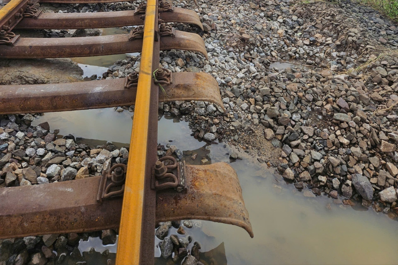 Nhiều khu vực đường sắt mưa lũ đã cuốn trôi lớp đá ballast, khoét sâu nền đường. Ảnh: VNR.