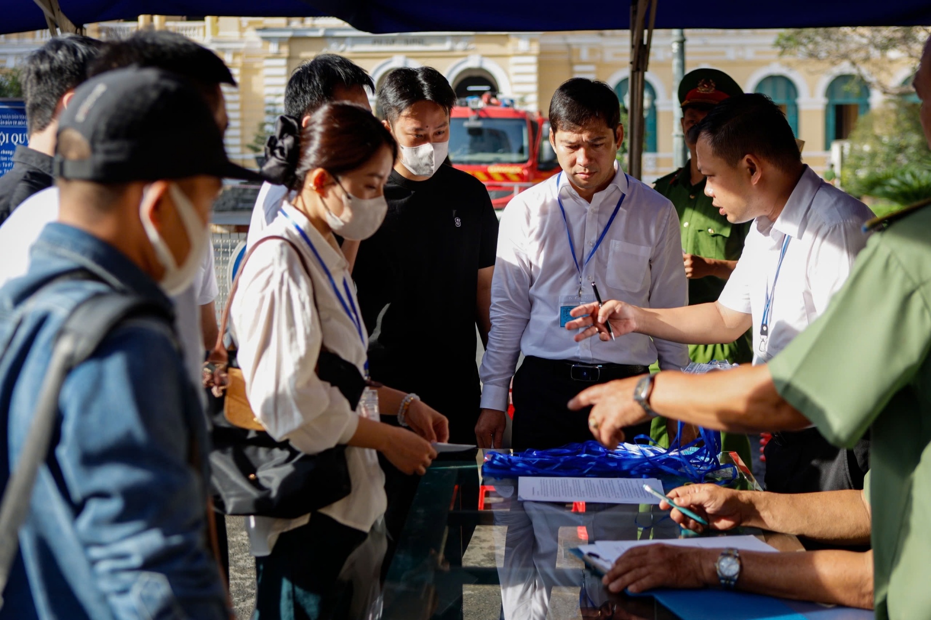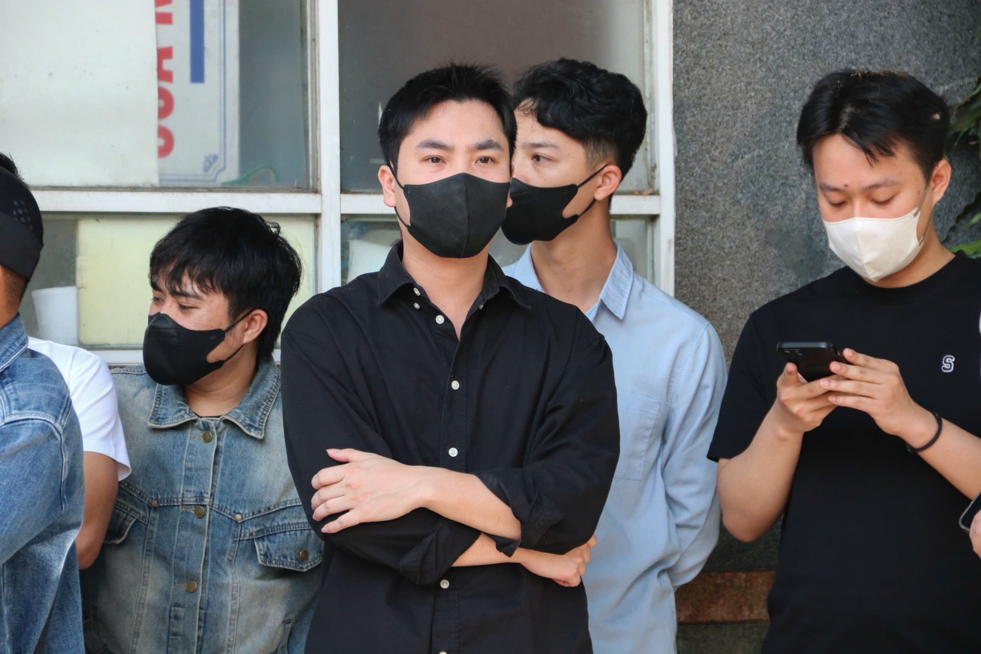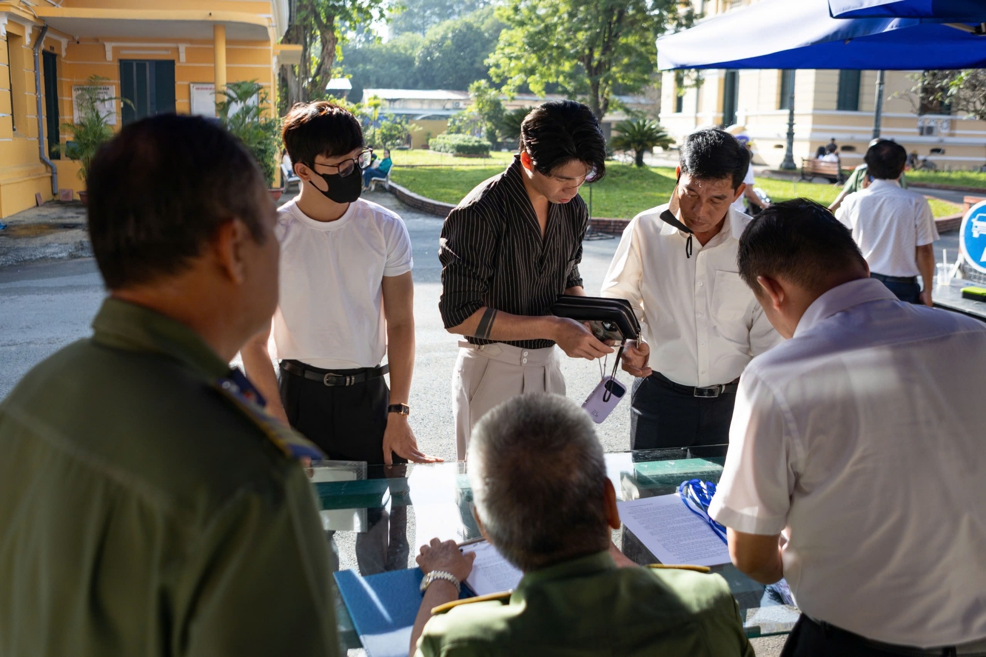 Trong đó, em trai (áo trắng đeo kính) và bố (áo sơ mi trắng ngoài cùng bên phải) Hằng Du Mục xuất hiện lúc 7h30, xuất trình giấy tờ với cơ quan chức năng để vào tham dự phiên tòa. Ảnh: Khương Nguyễn.