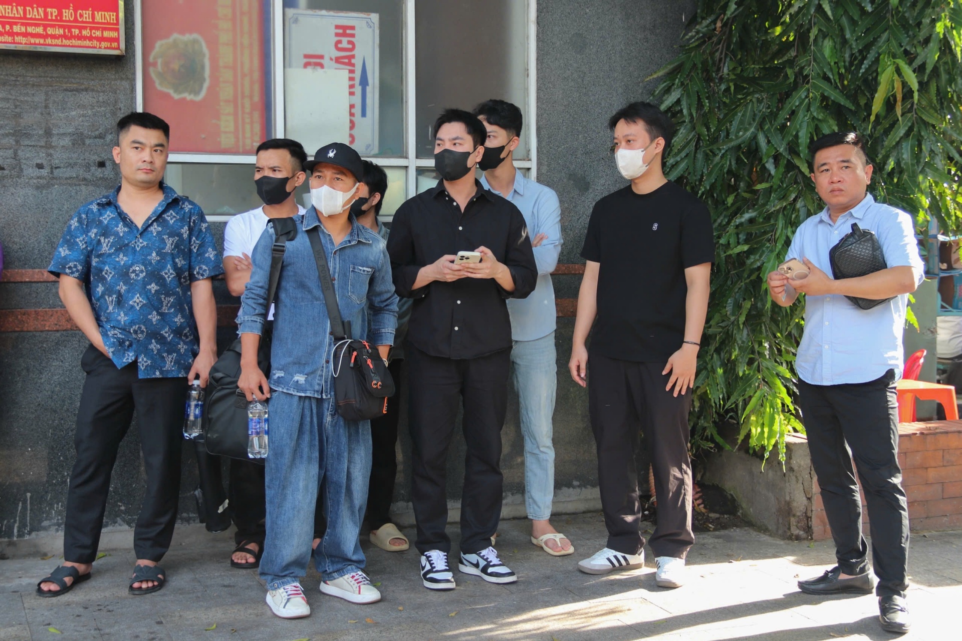 Chị ruột Quang Linh Vlogs, Phạm Thị Nhật Lệ (sơ mi trắng, búi tóc), cùng một số thành viên "team châu Phi" bao gồm Tiến Nguyễn, Nam Hoàng (anh rể Quang Linh Vlogs)... có mặt sau đó. Tuy nhiên, chỉ duy nhất Nhật Lệ được vào tham dự phiên tòa. Ảnh: Khương Nguyễn.