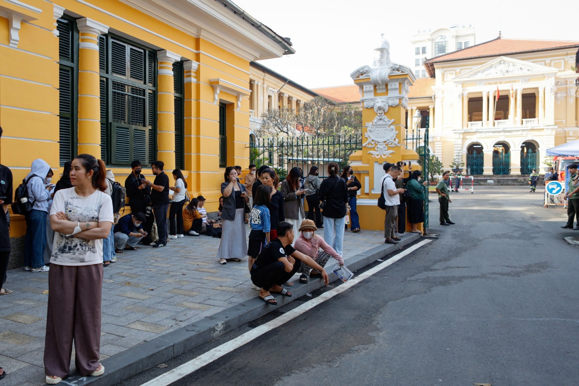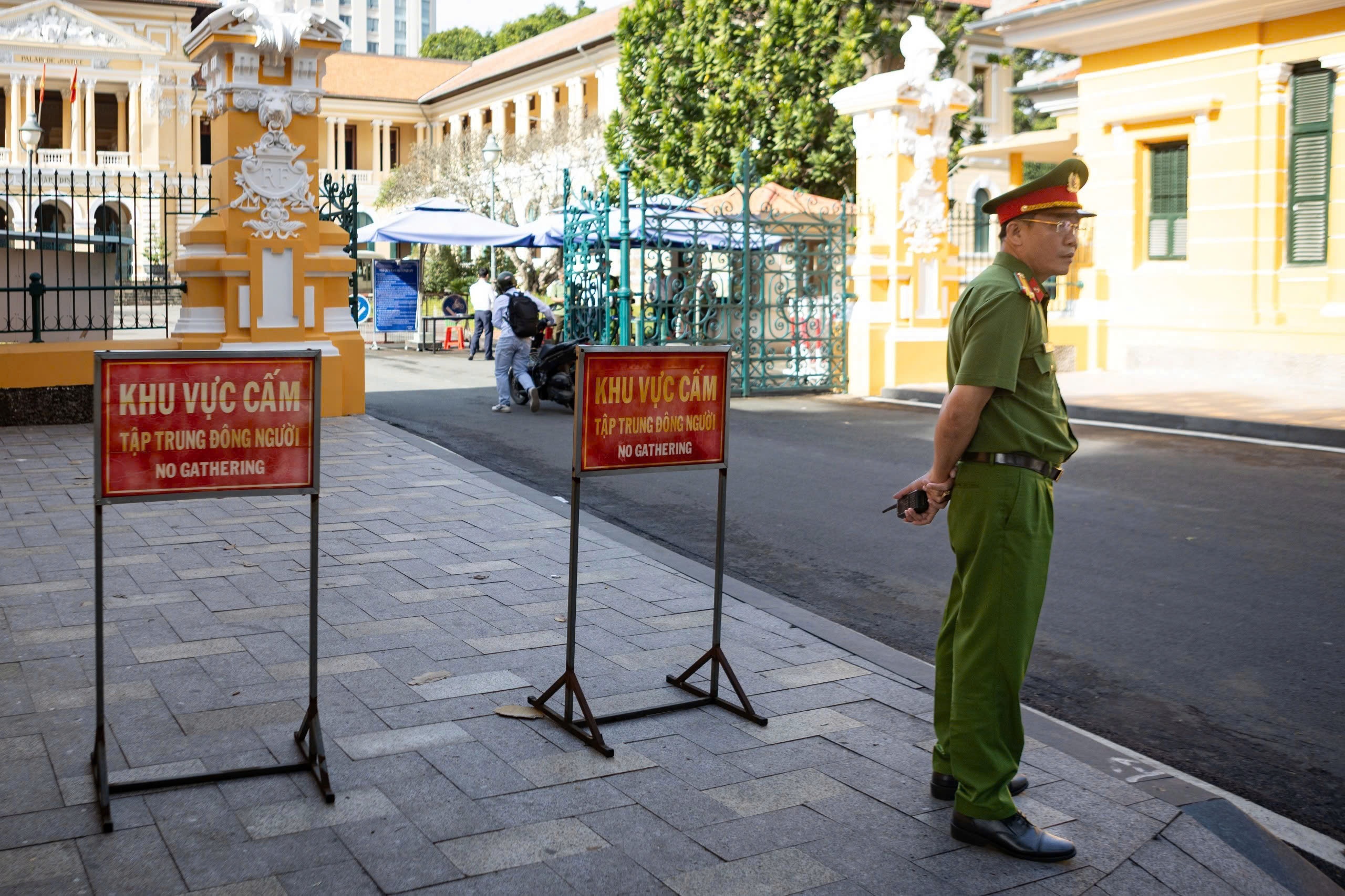 Khoảng 8h30, lực lượng chức năng yêu cầu người dân di chuyển ra khỏi khu vực trước TAND TP.HCM nhằm đảm bảo an ninh cho phiên tòa. Ảnh: Khương Nguyễn.