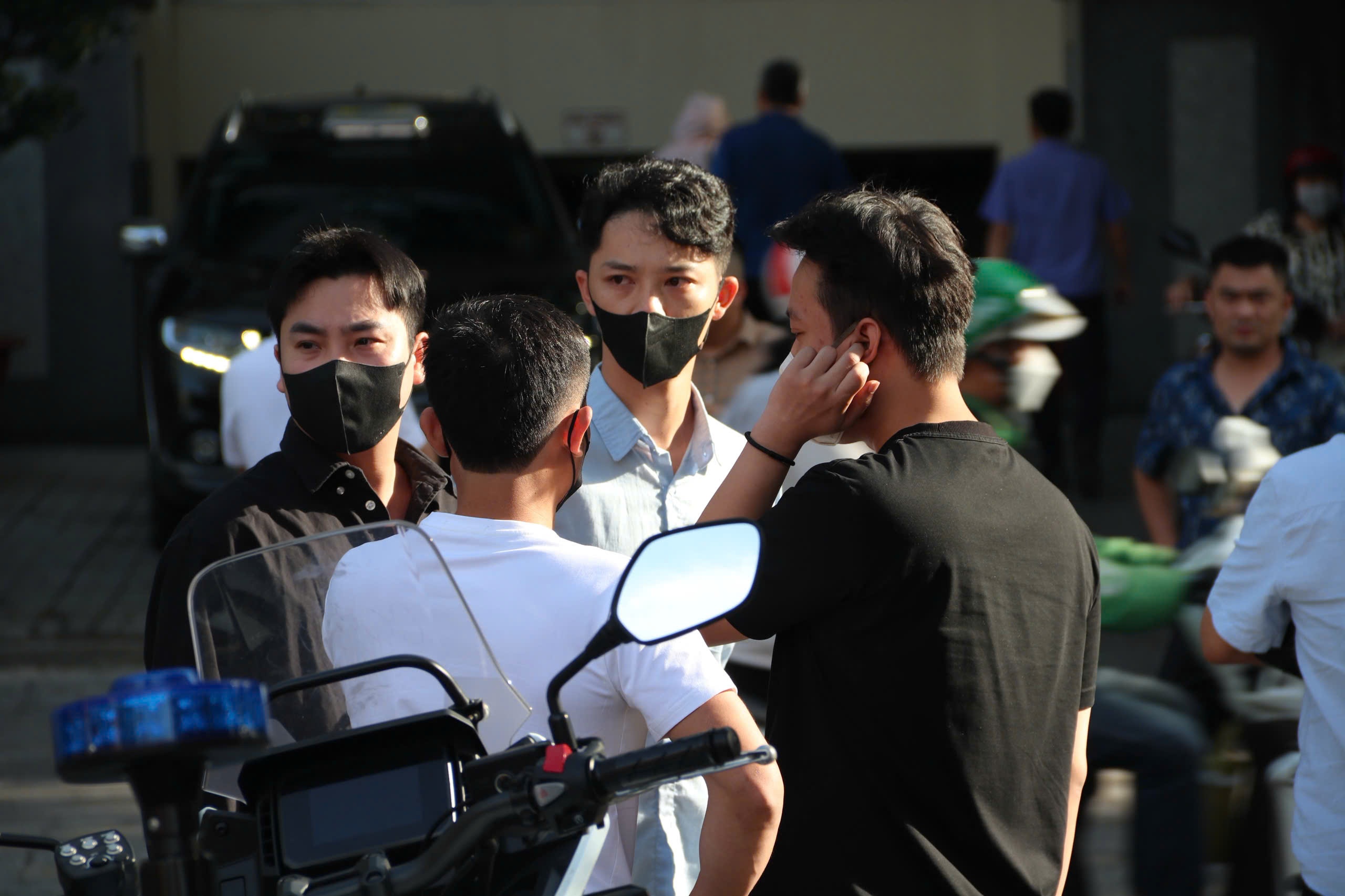 Nguyễn Nam Hoàng (anh rể Quang Linh Vlogs, ở giữa) và Quang Vinh (em trai Quang Linh Vlogs, áo đen bên phải) xuất hiện trước phiên tòa xét xử sáng 19/11. Ảnh: An Khánh.