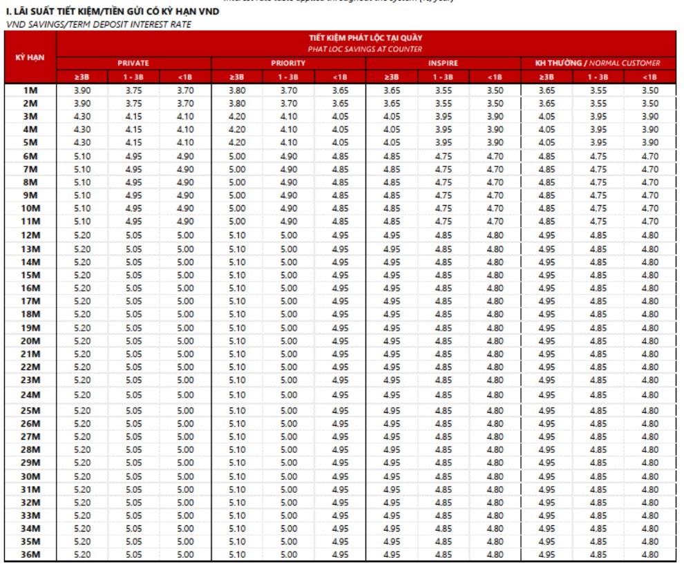 Nhóm Priority trên kênh trực tuyến có mức lãi suất từ 4%/năm cho kỳ hạn 1–2 tháng, 4,7%/năm cho kỳ hạn 3–5 tháng, 5,2%/năm cho kỳ hạn 6–11 tháng và 5,3%/năm cho các kỳ hạn dài 12–36 tháng. Trong khi đó, nhóm Inspire và Khách hàng thường nhận lãi suất 3,95%/năm cho kỳ hạn 1–2 tháng, 4,65%/năm cho kỳ hạn 3–5 tháng, 5,15%/năm cho kỳ hạn 6–11 tháng và 5,25%/năm cho kỳ hạn 12–36 tháng.