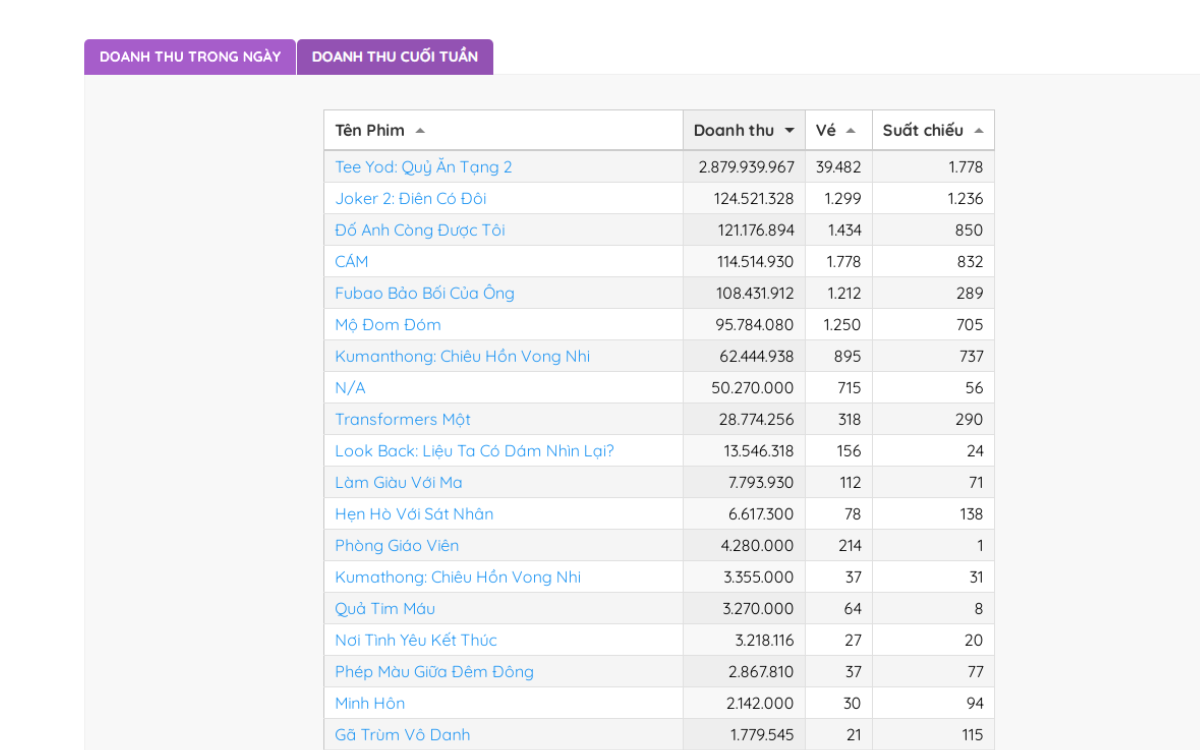 Trên BXH doanh thu phòng vé Việt, Tee Yod: Quỷ Ăn Tạng 2 đang dẫn đầu dù 18/10 mới công chiếu chính thức.