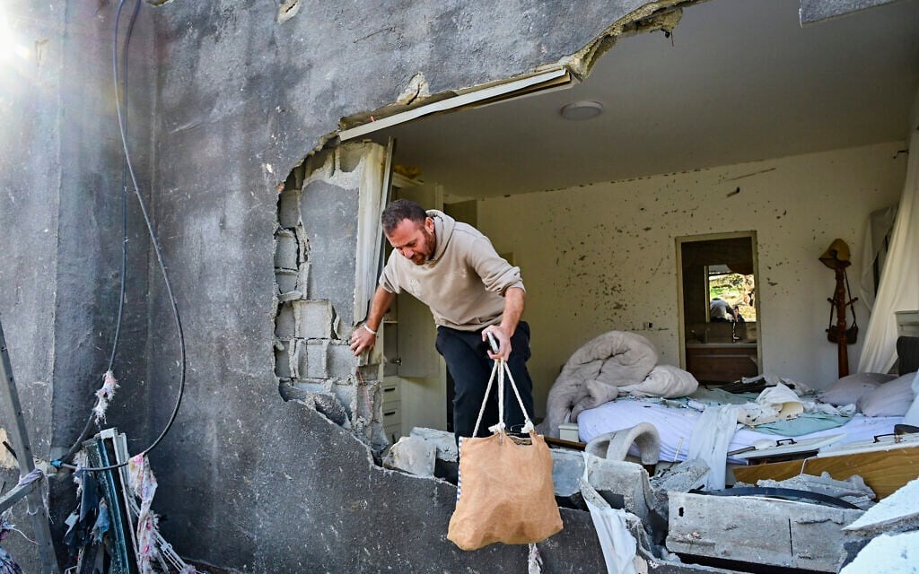 Một người đàn ông thu dọn đồ đạc từ ngôi nhà bị hư hại do tên lửa Iran phóng trong đêm tại Zarzir (miền bắc Israel) ngày 13-3. Ảnh: Michael Giladi/Flash90