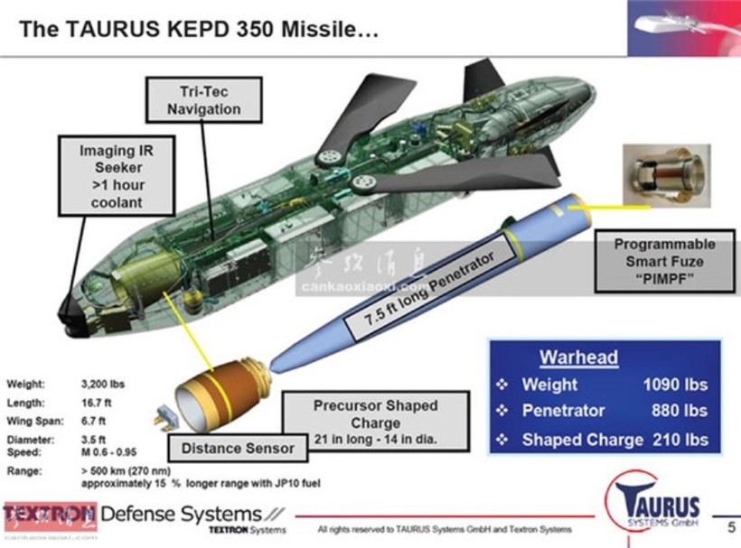 Tên lửa Taurus KEPD 350 sử dụng công nghệ tàng hình và có tầm bắn hơn 500 km. Tên lửa được trang bị động cơ phản lực cánh quạt và có tốc độ bay tối đa là Mach 1. Taurus có thể được lắp trên các máy bay chiến đấu của Mỹ và NATO như Tornado, F/A-18, F-15K, JAS 39 và Typhoon.