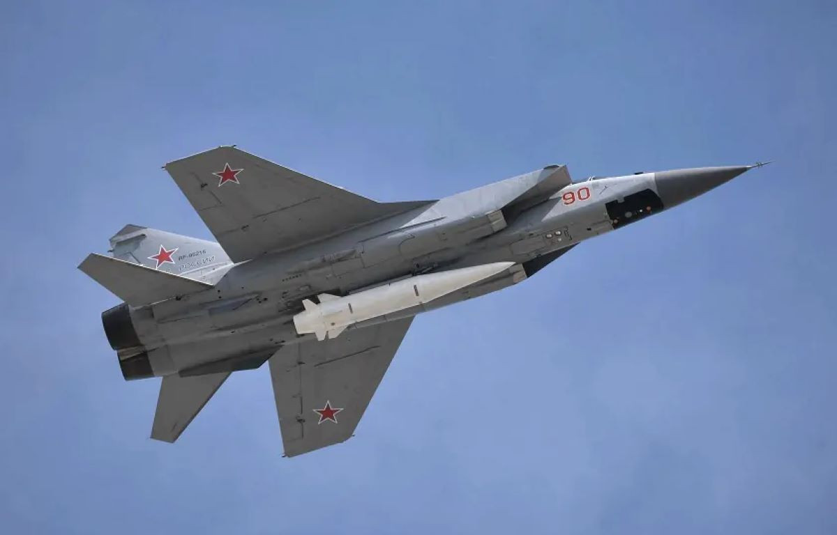 Máy bay chiến đấu MiG-31K của Không quân Nga mang theo tên lửa hành trình siêu thanh Kh-47 Kinzhal. Ảnh: BQP Nga/armyrecognition.com