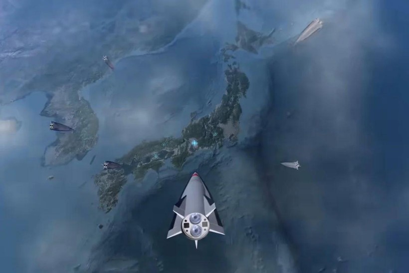 Cuối video, một đoạn mô phỏng hiển thị 8 tên lửa bay theo đội hình hướng về Nhật Bản, với nhiều điểm tấn công được đánh dấu trên bản đồ, minh họa tầm hoạt động và khả năng tấn công phối hợp của loại vũ khí này.