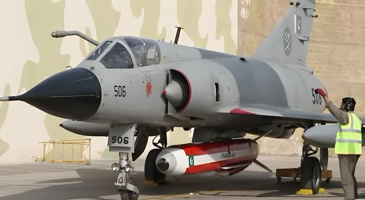 Một máy bay tiêm kích-ném bom Mirage IIIEA ROSE của Không quân Pakistan (PAF) mang tên lửa hành trình phóng từ trên không Taimoor (ALCM) gắn ở điểm treo chính giữa thân máy bay. Hình ảnh: Ban Quan hệ Công chúng Liên quân (Inter-Services Public Relations)/thedefensepost.com