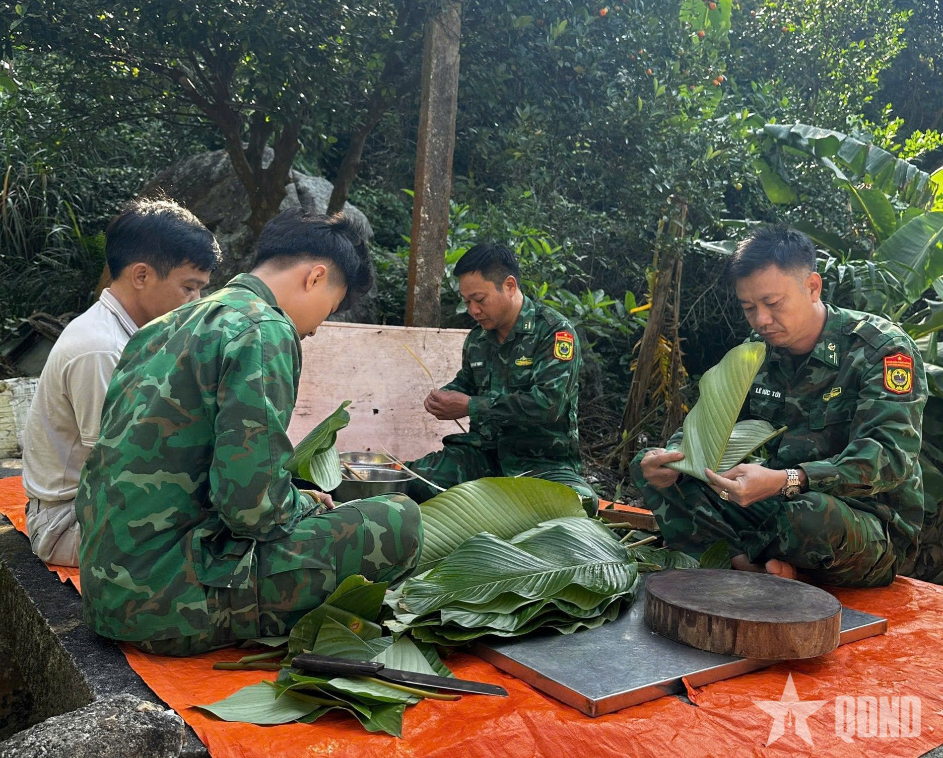 Cán bộ, chiến sĩ Trạm Kiểm soát Biên phòng Hòn Sơn Chà (Đồn Biên phòng Hải Vân) và Trạm Hải đăng Sơn Chà (Bảo đảm an toàn Hàng hải Trung Bộ) cùng nhau gói bánh chưng Tết.