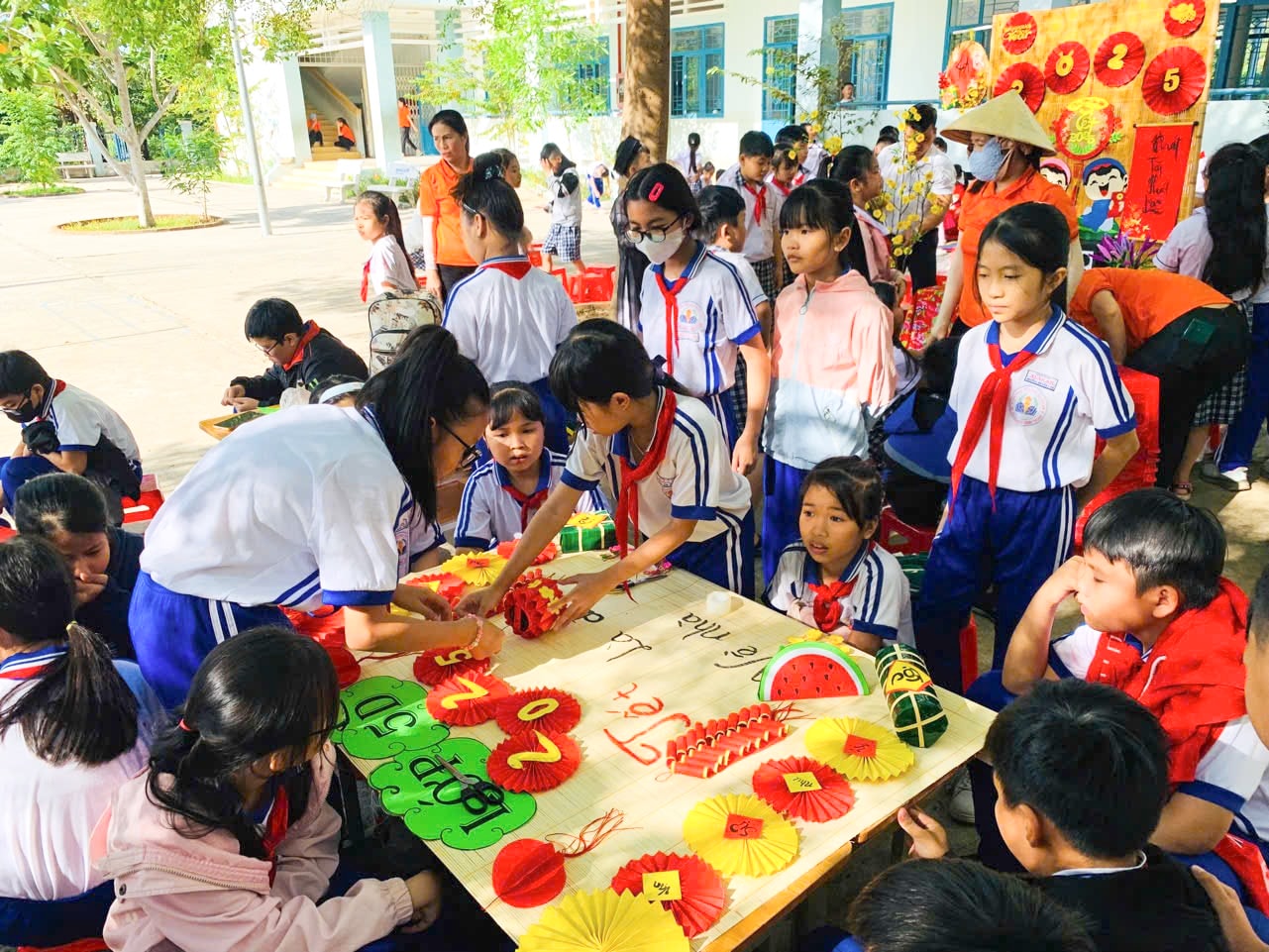 Học sinh Trường Tiểu học Xuân An (phường Hàm Thắng) trang trí góc Tết năm 2025