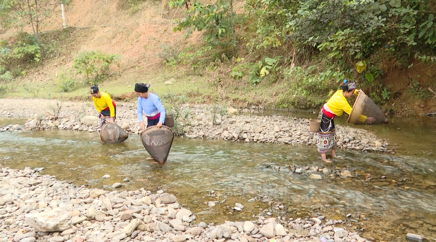 Phụ nữ Thái đi xúc cá để chuẩn bị cho tết ăn cá.