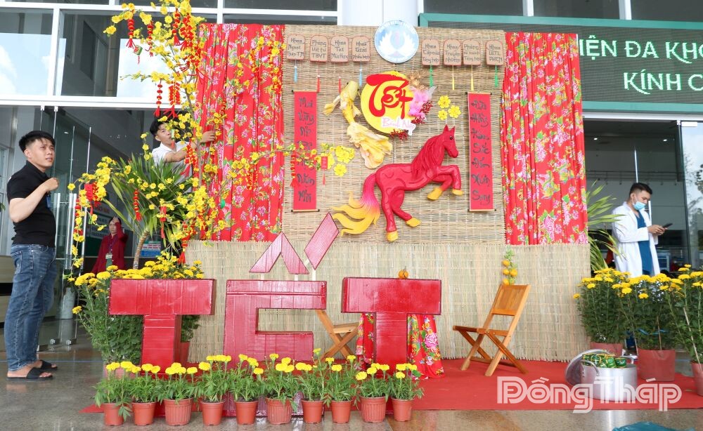 Không khí Tết tại Bệnh viện Đa khoa Đồng Tháp năm nay đặc biệt ấm áp và rực rỡ. Những cụm tiểu cảnh Tết được trang trí bắt mắt khắp khuôn viên bệnh viện, từ sảnh chính đến các khoa, phòng. Cành mai vàng rực, cành đào hồng thắm, những chậu hoa xuân rực rỡ sắc màu đã làm dịu bớt không gian lạnh lẽo của bệnh viện, mang đến niềm vui và sự lạc quan cho người bệnh và thân nhân.