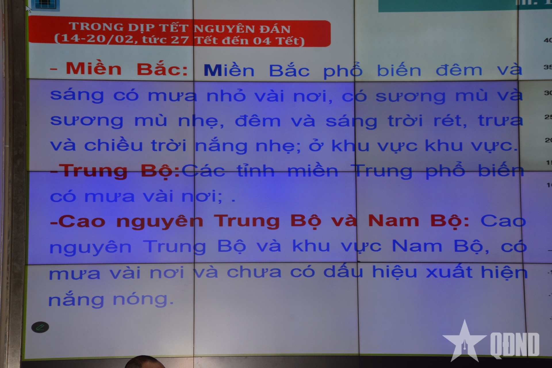 Trước Tết (10 đến 13-2), không khí lạnh tăng cường yếu lệch Đông khiến Bắc Bộ nhiều mây, có mưa nhỏ, sương mù sáng sớm; trưa chiều hửng nắng, nhiệt độ cao nhất 19-26 độ C tùy khu vực. Trung Bộ mưa giảm dần trong ngày; Tây Nguyên và Nam Bộ ngày nắng, đêm sáng sớm có sương mù nhẹ, một số nơi phía Nam Tây Nguyên và Nam Bộ có thể xuất hiện mưa trái mùa. Trong những ngày chính Tết (14 đến 20-2), chưa có dấu hiệu xuất hiện không khí lạnh mạnh; Bắc Bộ đêm và sáng rét nhẹ, có sương mù, trưa chiều nắng nhẹ; Trung Bộ, Tây Nguyên và Nam Bộ mưa vài nơi, thời tiết nhìn chung thuận lợi cho các hoạt động du xuân, đi lại.