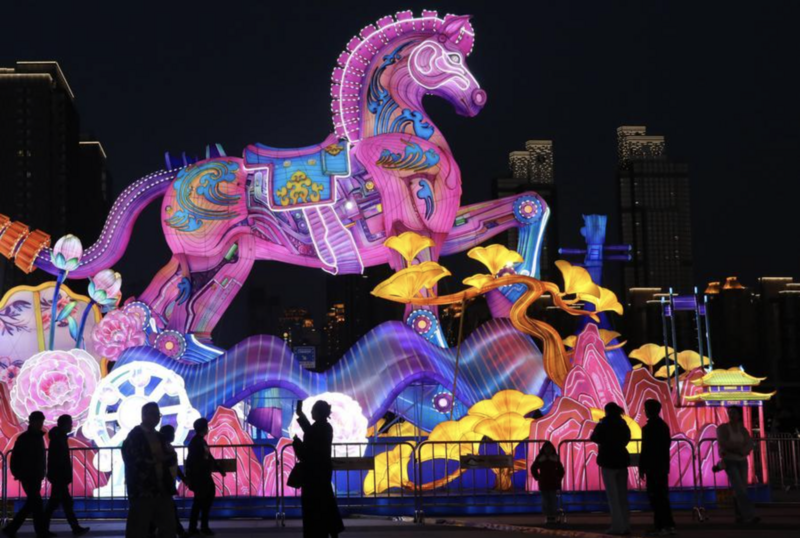 Người dân chiêm ngưỡng tác phẩm sắp đặt ánh sáng lấy cảm hứng từ ngựa tại Quảng trường Văn hóa Shishan ở thành phố Tô Châu, Trung Quốc. Ảnh: Xinhua