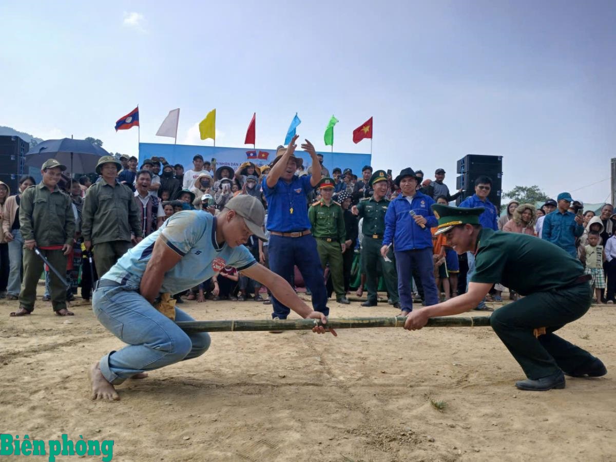 Cán bộ Đồn Biên phòng Ga Ry tham gia trò chơi cùng nhân dân Lào tại Chương trình “Tết Bunpimay-thắm tình hữu nghị nhân dân biên giới Việt Nam-Lào” năm 2026. Ảnh: Trúc Hà