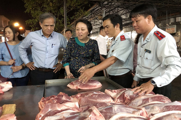 Lực lượng chức năng kiểm tra công tác đảm bảo an toàn thực phẩm tại chợ đầu mối Hóc Môn (TP.HCM) - Ảnh: PV