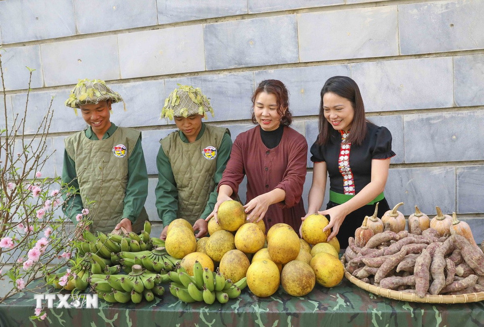 Phụ nữ dân tộc Thái Điện Biên cùng các chiến sỹ chuẩn bị không gian trưng bày lương thực hậu phương tại chương trình. (Ảnh: Xuân Tư/TTXVN)