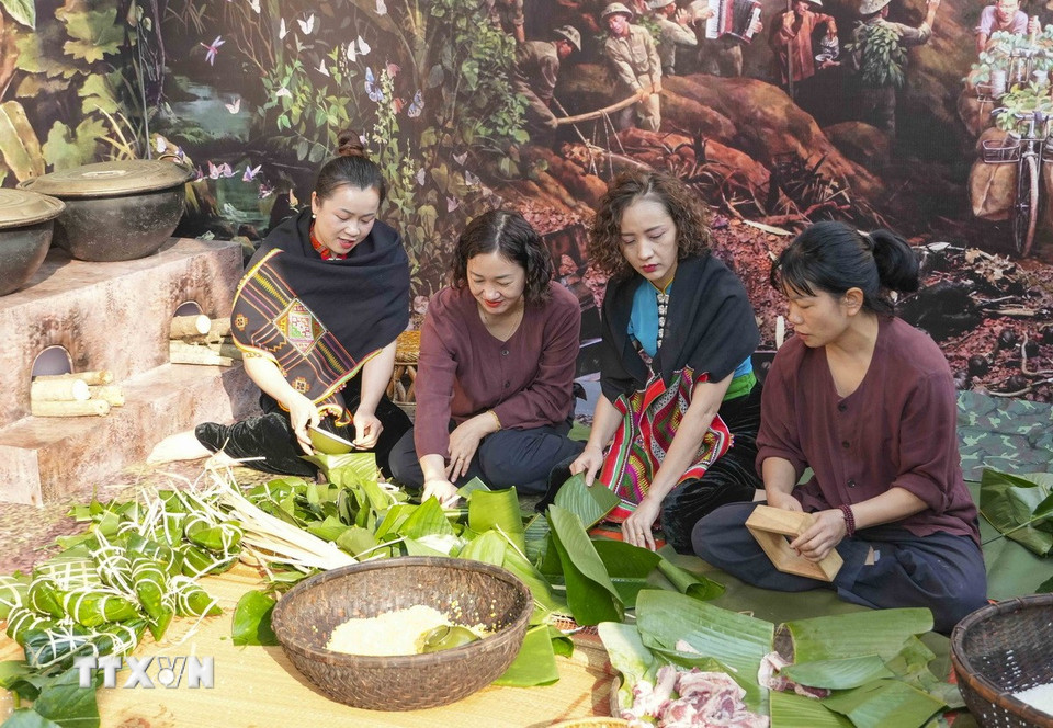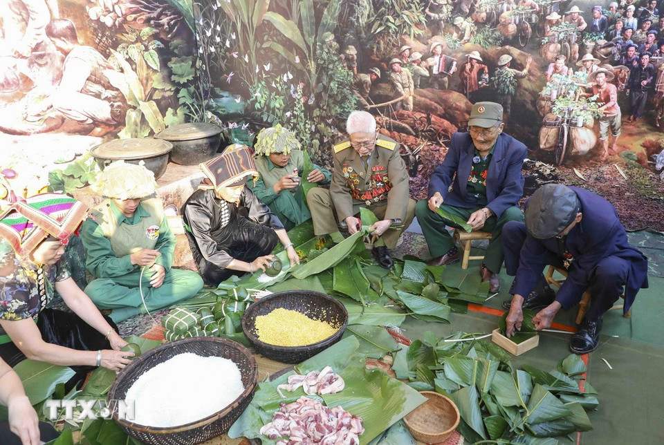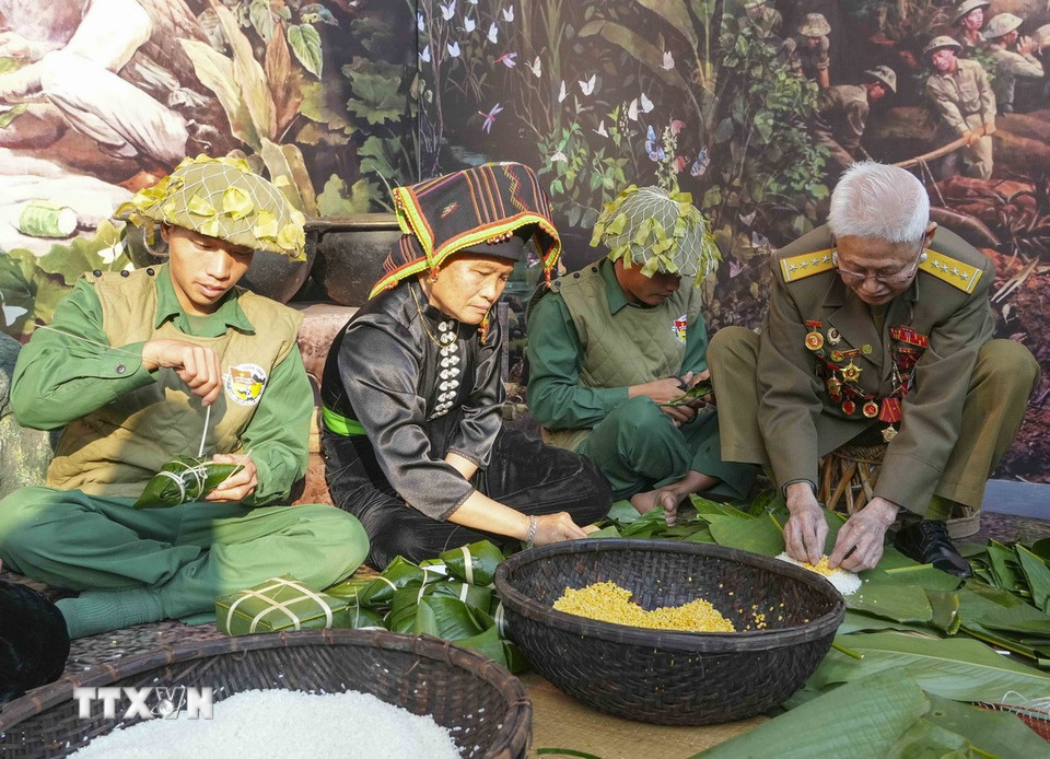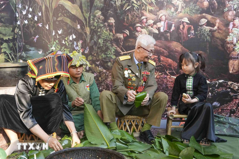 Tái hiện hình ảnh các thế hệ quây quần gói bánh chưng gợi lên tinh thần đoàn kết quân-dân trong kháng chiến chống thực dân Pháp. (Ảnh: Xuân Tư/TTXVN)