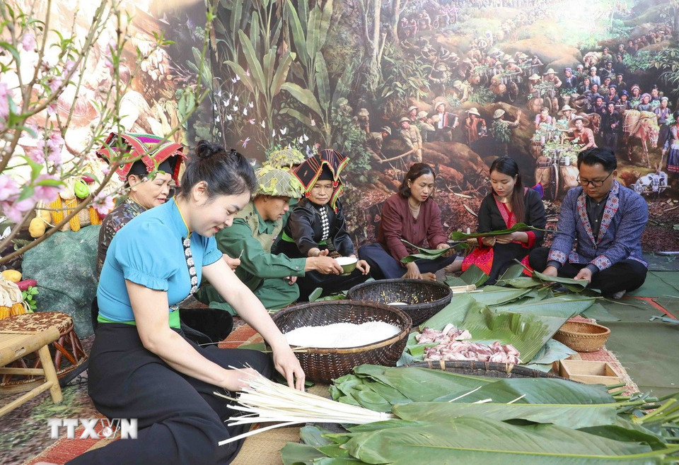 Mọi người quây quần gói bánh chưng, tái hiện không gian đậm chất lịch sử của mùa Xuân năm 1954. (Ảnh: Xuân Tư/TTXVN)
