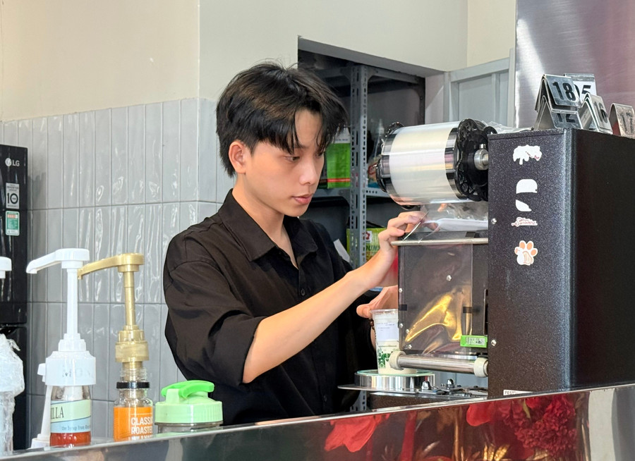 7 giờ sáng mùng 1 Tết, khi nhiều gia đình còn đang chúc Tết, du xuân, Trần Đình Phú (lớp 10A2, Trường THPT Nguyễn Khuyến, phường An Khê) đã bắt đầu ca làm tại một quán cà phê trên địa bàn. Dòng khách ra vào liên tục khiến cậu học trò lớp 10 gần như không có thời gian nghỉ.