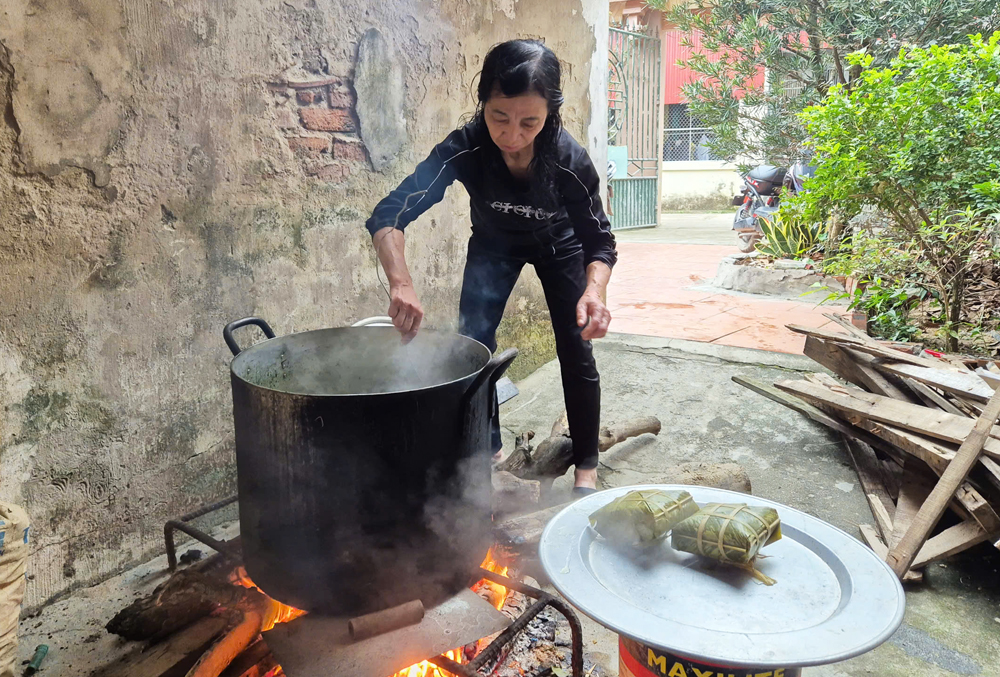Chúng tôi ghé nhà bà Phạm Thị Thanh, hộ dân trong thôn. Bà Thanh năm nay gần 70 tuổi đang trông nồi bánh chưng sôi ùng ục. Bên bếp lửa hồng, củi cháy nổ tí tách, bà Thanh tâm sự, năm nay nhất định phải tự tay gói bánh bởi đây là cái Tết cuối cùng gia đình ở nơi này.