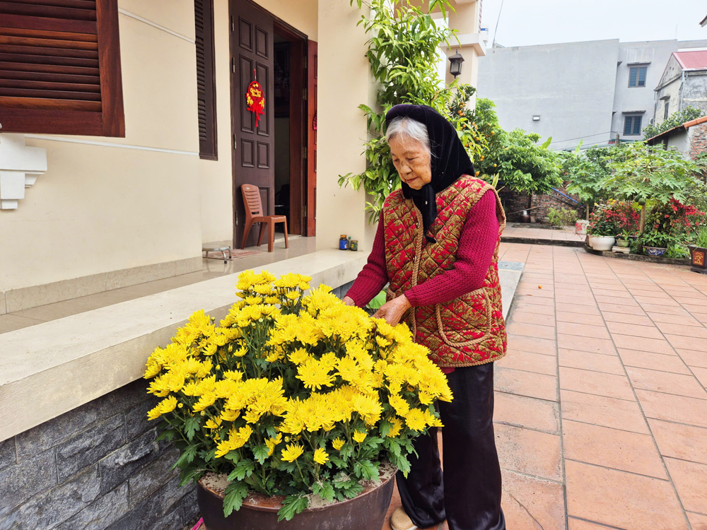 Gặp bà Đỗ Thị Tựu năm nay 90 tuổi trong căn nhà khang trang, sân vườn rộng rãi, bà tỉ mỉ chăm từng nhánh cúc để đón xuân. Bà kể, cả đời làm lụng vất vả, nay con cháu khấm khá, mỗi khi nhà có việc lại tụ họp đông vui. Thế nhưng bà cũng lo, nếu nơi ở mới chật chội thì khó có thể tổ chức những buổi sum vầy đông đủ. Mong mỏi của bà là Nhà nước sẽ giúp người dân có chỗ ở tốt hơn để yên tâm sinh sống.