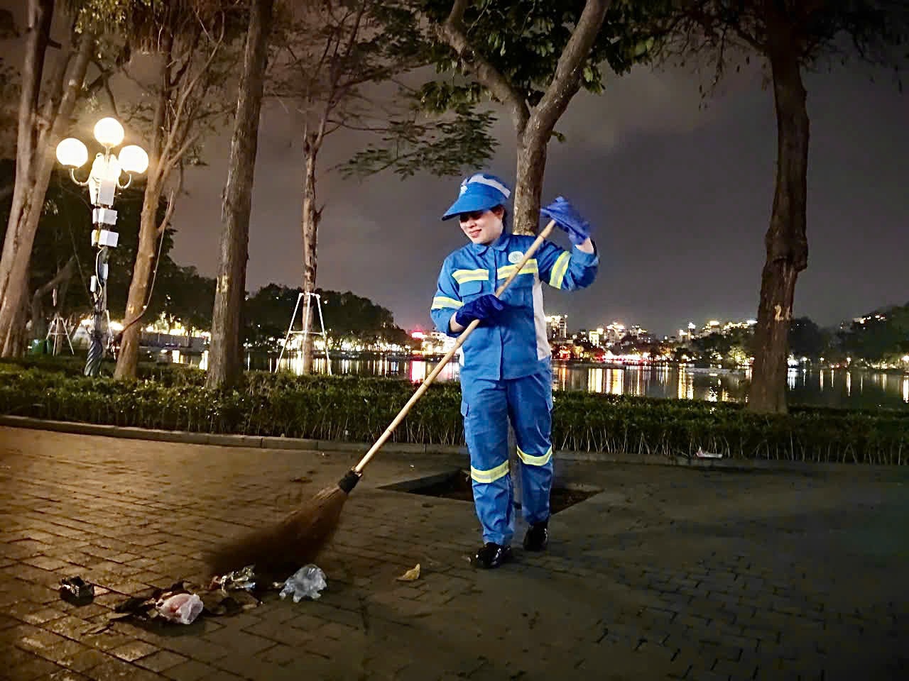 Sau khi tiếng pháo giao thừa kết thúc cũng là lúc chị Ninh Thị Loan và các đồng nghiệp bắt đầu nhiệm vụ tại hồ Hoàn Kiếm. Ảnh: HH